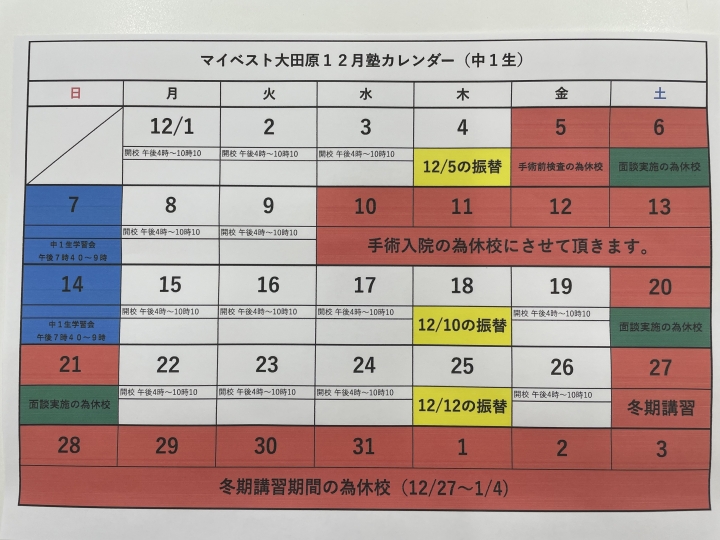 中1生12月スケジュール