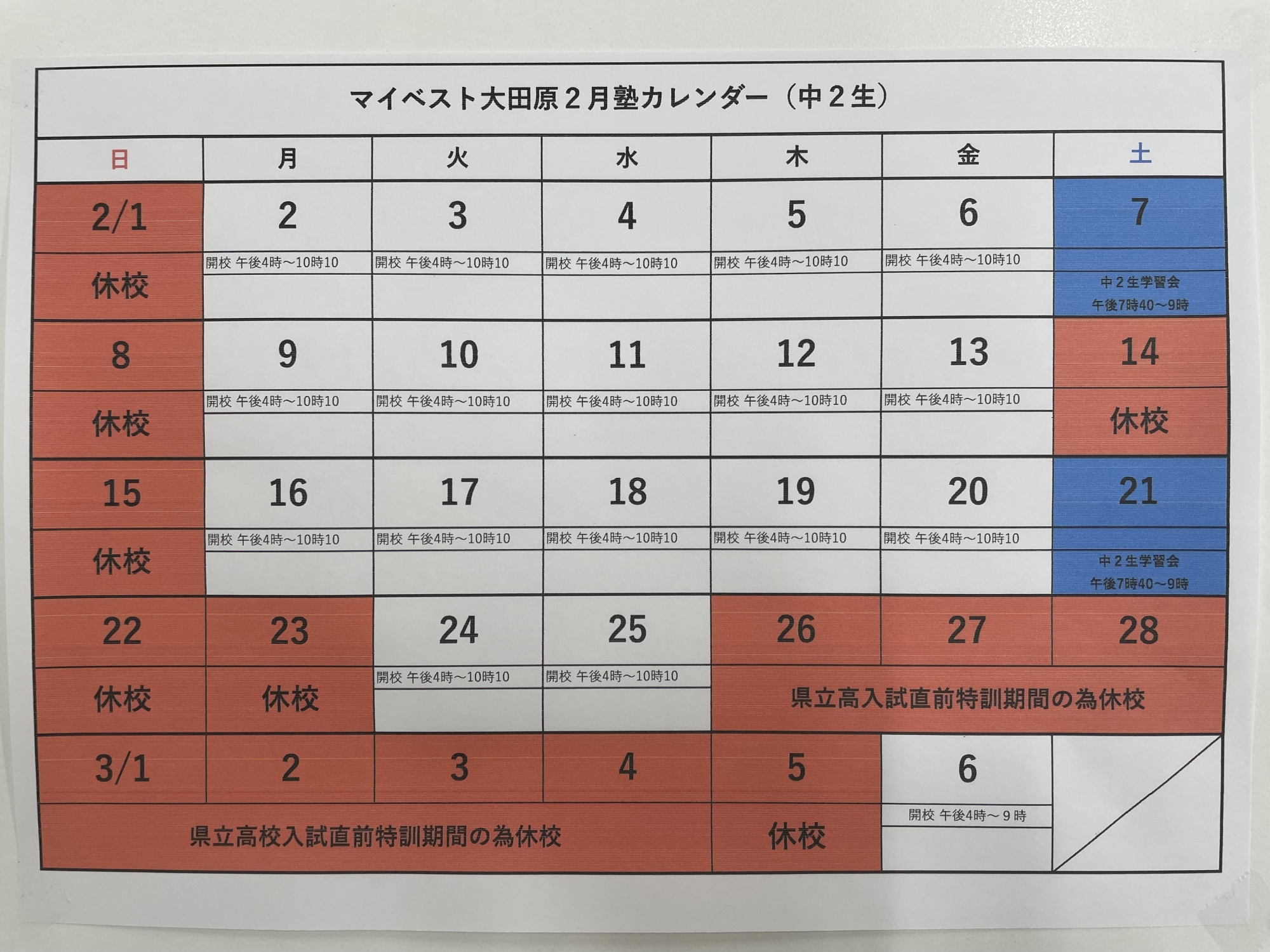 中2生2月スケジュール