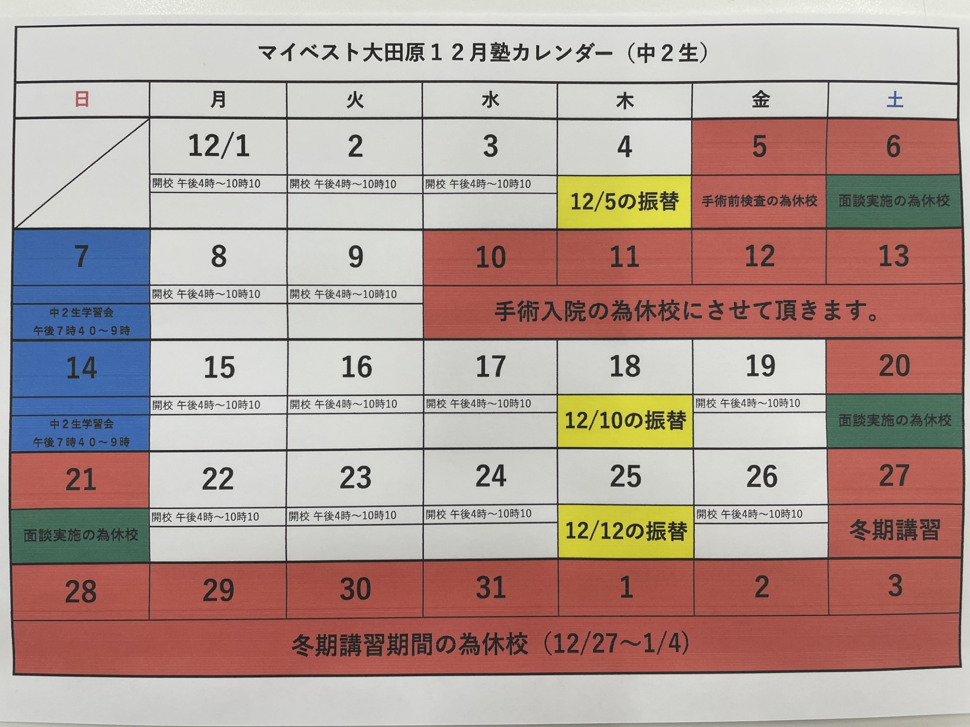はじめに、12月中に手術入院となりましたことをご連絡させて頂きます。ご迷惑をおかけします。幸い、4日間程度の入院で済みそうです。入院延長となった際には再度ご連絡をさせて頂きます。振替に関しましては別紙の12月カレンダーにも記載させていただきました。